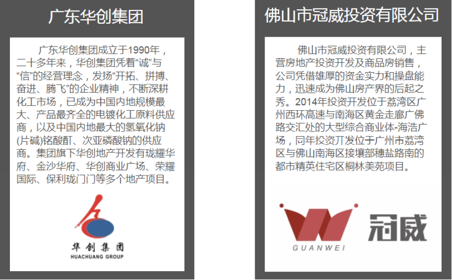 广东华创集团成立于1990年,二十多年来,华创集团凭着“诚”与“信”的经营理念,发扬“开拓、拼搏、奋进、腾飞”的企业精神,不断深耕化工市场,已成为中国内地规模最大、产品最齐全的电镀化工原料供应商,以及中国内地最大的氢氧化钠(片碱)铭酸酐、次亚磷酸钠的供应商。集团旗下华创地产开发有珑耀华府、金沙华府、华创商业广场、荣耀国际、保利珑门门等多个地产项目。